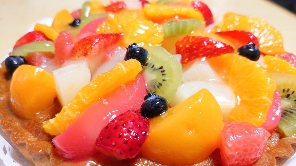 フルーツタルトのベースとなるタルト生地は、サクサクとして軽やかな食感が特徴です。バターたっぷりのパート・シュクレ生地が使われており、香ばしい風味がフルーツやクリームと絶妙にマッチします。この生地の食感が、全体のバランスを引き立てます。